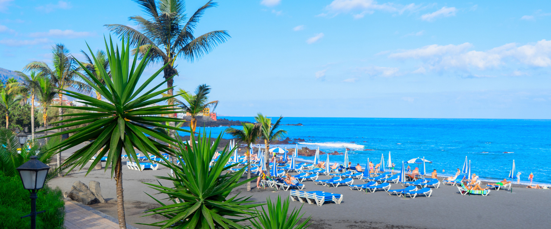 Dunkle Felsküste und schwarzer Kiesstrand auf den Kanarischen Inseln. Ein Boot zieht eine weiße Spur durch das tiefblaue Meer.